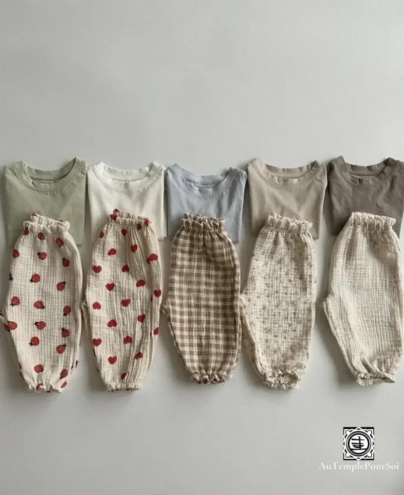 Fabriqué en mousseline de coton légère et respirante, ce pantalon est parfait pour les activités quotidiennes tout en protégeant la peau sensible de votre enfant. Son style décontracté est enrichi par une variété de motifs et de couleurs, allant des teintes unies à des motifs charmants, comme des petits cœurs. Facile à enfiler avec une taille élastique confortable, il permet à votre bébé de bouger librement, rendant chaque exploration un plaisir.