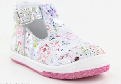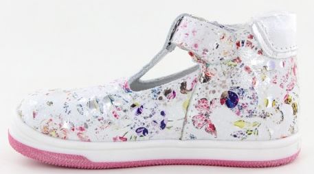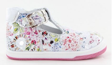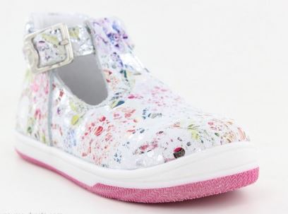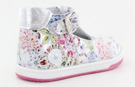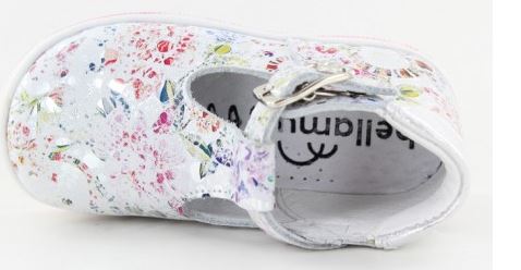 Chaussures bébés, type bottillons à boucle pour filles, de la marque Bellamy. Empeigne en cuir nacré blanc, imprimé fleuri et pois argentés. Col cheville matelassé, coloris argent. Doublure cuir avec soutien de la voûte plantaire. Fine semelle bicolore, légèrement renforcée à l’avant.